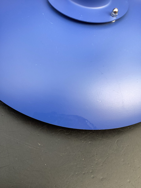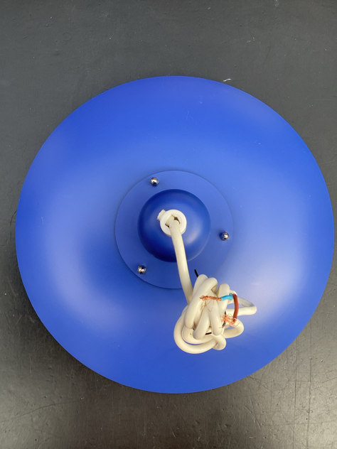 Fineste, minimalistiske pendel i original koboltblå lakering. Fremstillet af Jeka, mærke herfra. Model Luna. FLOT form og generelt flot stand; har et mindre blankt område på kanten, der muligvis kan fjernes ved grundig rengøring. Ellers intet at bemærke.