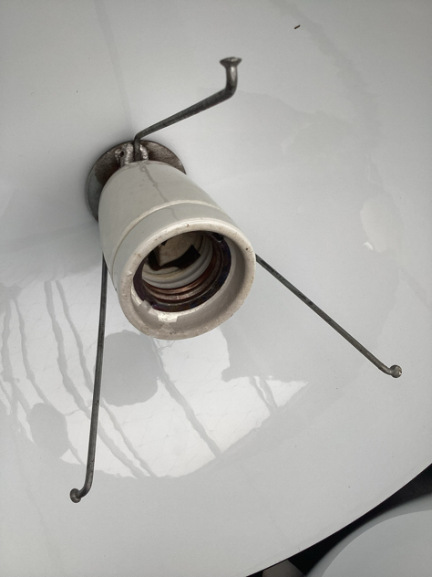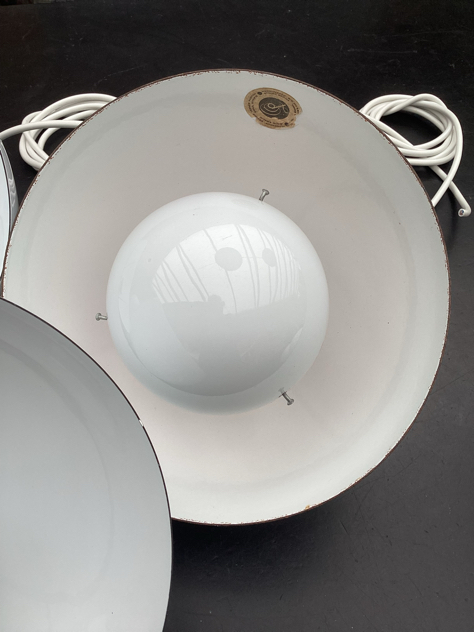 Design af Verner Panton, fremstillet af Louis Poulsen, har 3 stk i hvid emalje. Er lidt i tvivl om det indvendige stål stativ er originalt, eller bare af meget tidlig dato…døm selv. Virker i hvert fald efter hensigten. 2 af bundskålene er malet hvid indvendig – nok for at give mere lys, end den originale, indvendige orange emalje muliggør. (OBS: har en ekstra hvid bundskål med indvendig orange emalje – den har dog et større afslag på emaljen udvendigt, se billede. Bundskålene kan byttes om, hvis det foretrækkes)