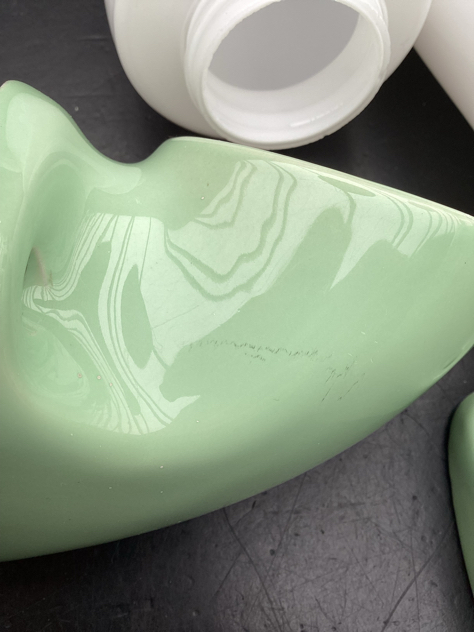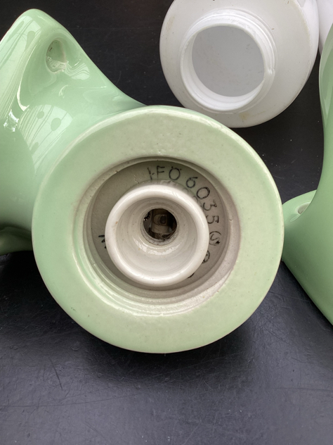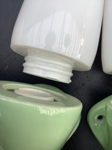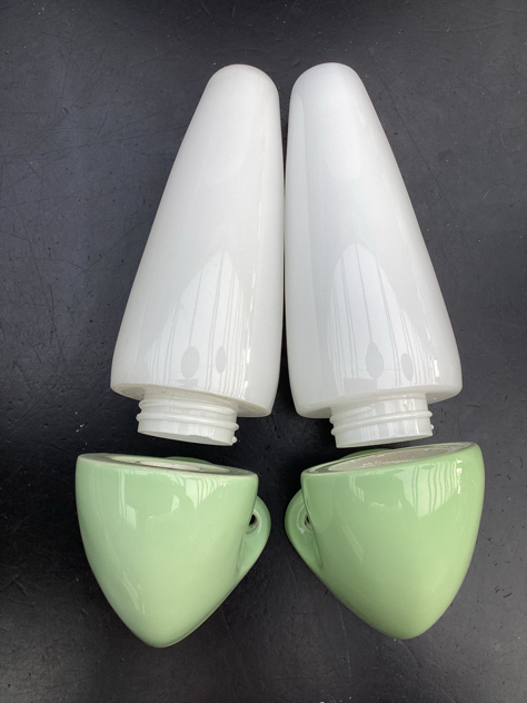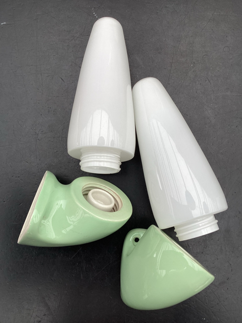 Super FINE Ifö badeværelseslamper, model 6035, designet af Stig Carlsson. Smuk, blank mint farvet porcelæn med opalglas i fakkelform. Den ene vægdel har en overfladisk sort streg, se billede. Desuden har den ene et afslag omkring det ene skruehul, se billeder. Ellers PERFEKT stand på både porcelæn og glas.