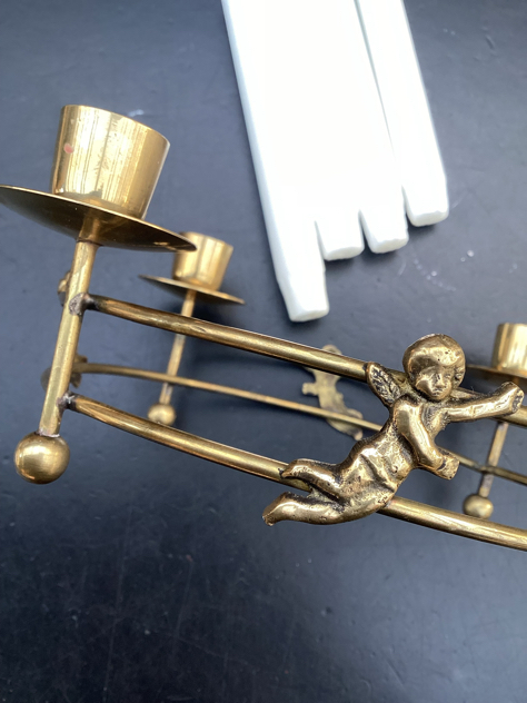 SMUKKESTE adventsstage i messing. Elegant udformning med fine englebasser på siden. Tung og gedigen. Til almindelige lys.