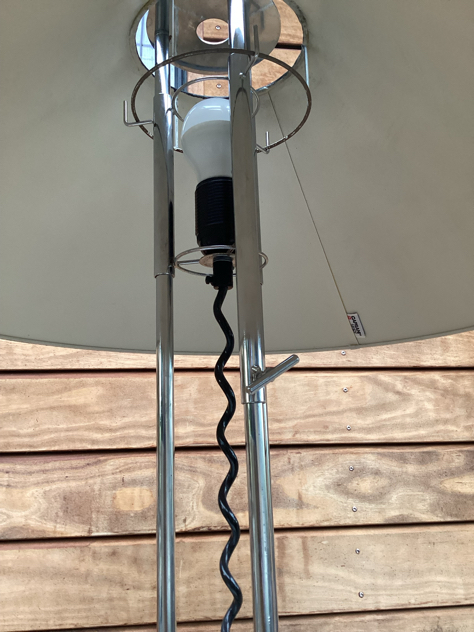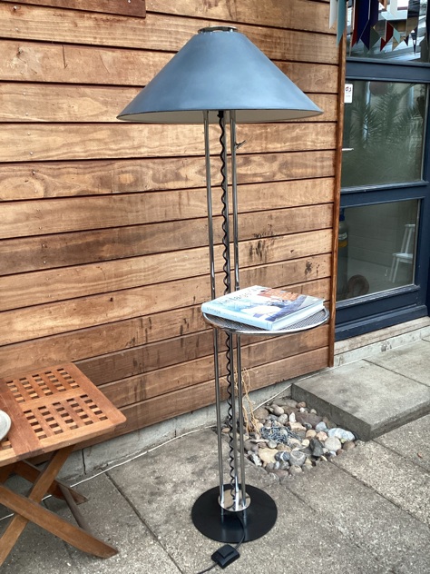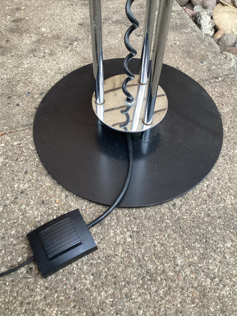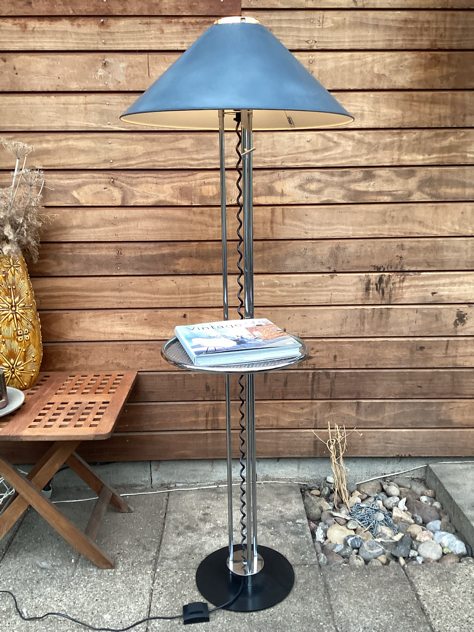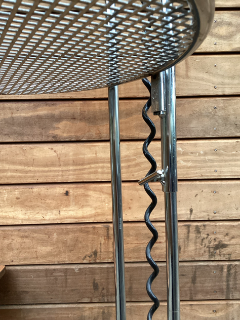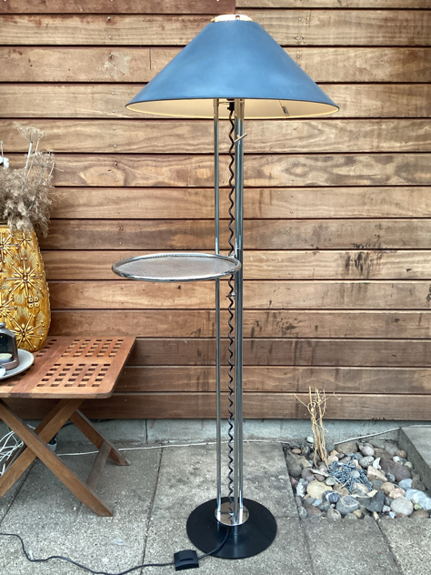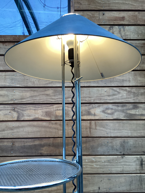 Caprani Light – SUPER COOL og sjælden gulvlampe med sidebord. Fremstillet i chrome med justerbar højde på både skærm og bord. Mærket Caprani på både fod og skærm. FLOT vintage stand. Måske skærmen er malet? – den krakelerer lidt i toppen, se billede.
