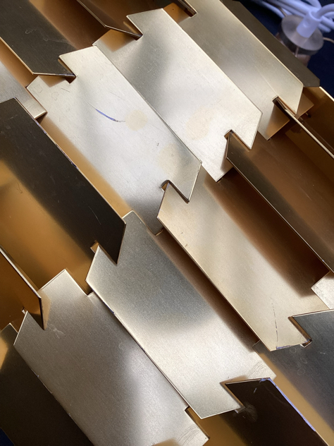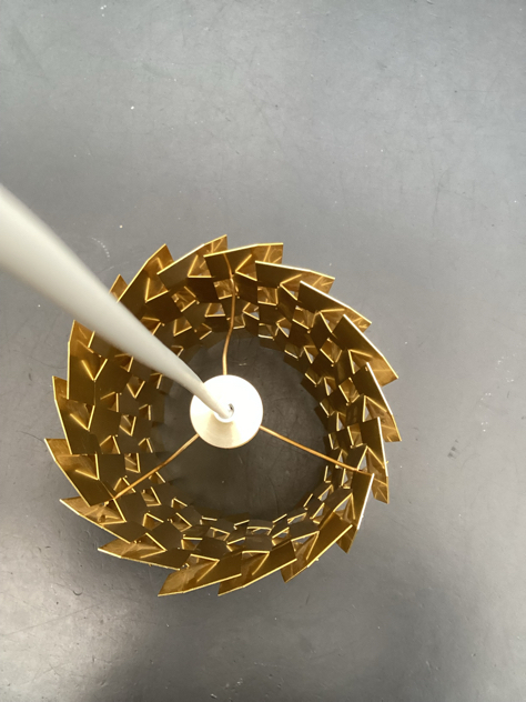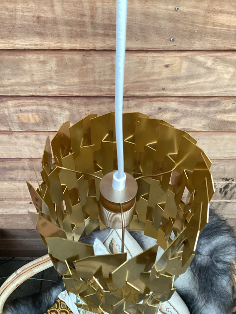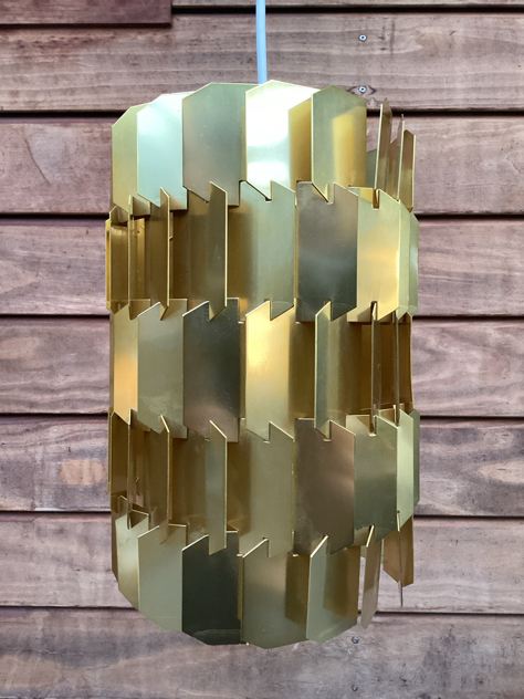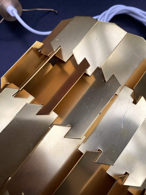 Super cool; Flettede profiler i messing, der danner en cylinder – gir et fantastisk lys. Det originale ophæng er gået til, men der er lavet NYT i massiv messing – efter mål på det originale. Desuden ny fatning monteret.