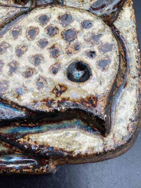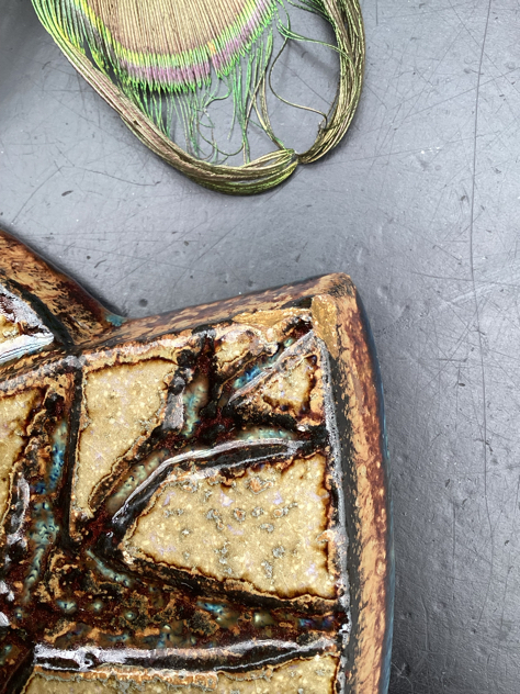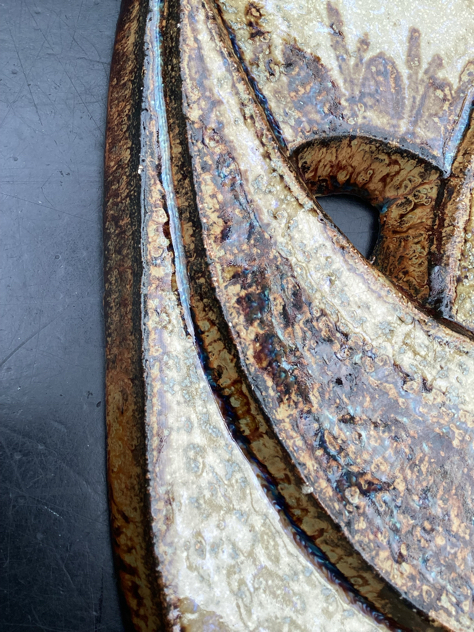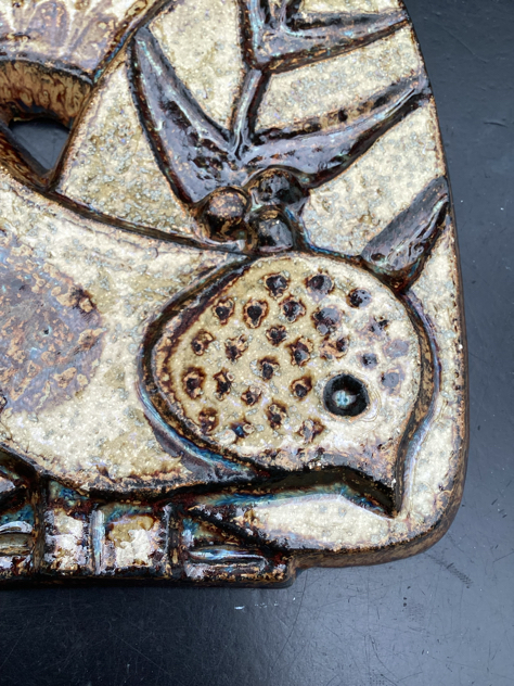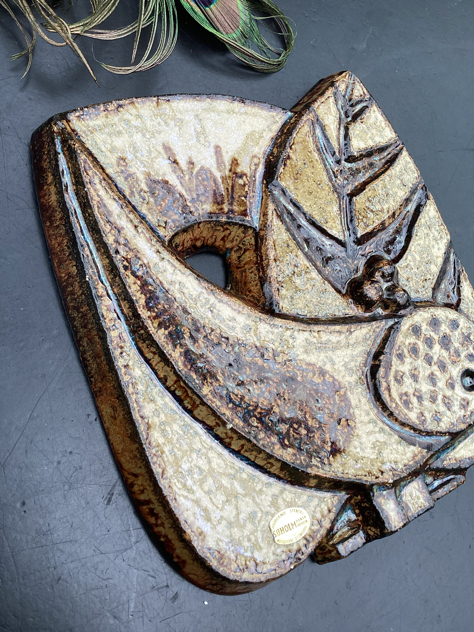 Super fint relief med 1 fugl i lækker blank glasur med turkise toner. Har få små afstød et par steder og et lidt større i toppen th, se billede. Svært at se, da det falder i med glasuren. Ellers PERFEKT stand – og klar til ophæng.