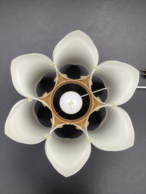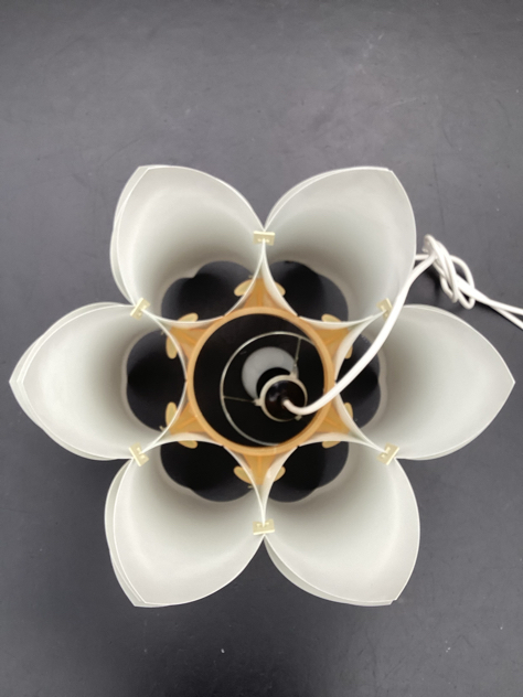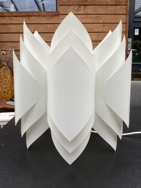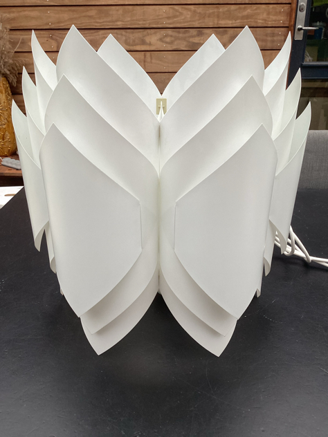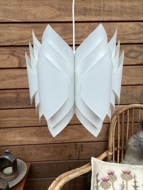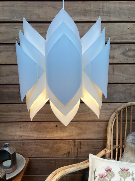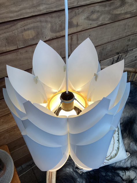 Vintage pendler i foldet hvid PVC med sandfarvede klemmer. Modellerne er formgivet i 1972 af Lars Schiøler for Hoyrup Light. Blev oprindeligt solgt som DIY lamper – saml selv. SMUKKE pendler, der giver et fantastisk dejligt lys.