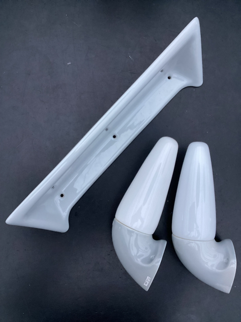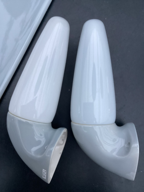 Super FLOT Ifö hylde og badeværelseslamper, model 6035, designet af Stig Carlsson. Elegant gråt porcelæn med opalglas i fakkelform. Jeg har 4 stk, 2 sæt. Den ene vægdel er lidt lysere i farven, end de øvrige og er heller ikke glaseret indvendigt ved fatningen, se billeder.
