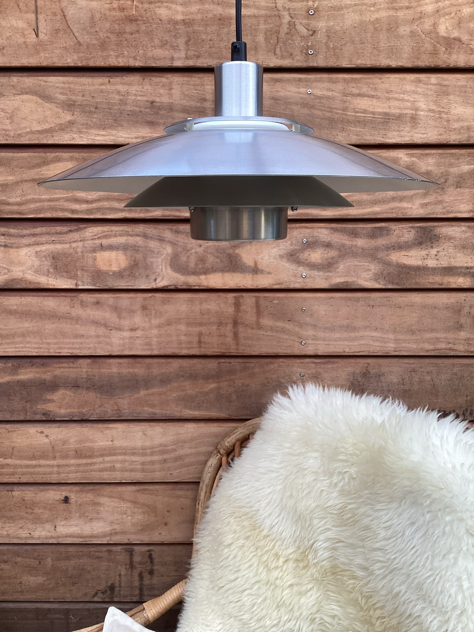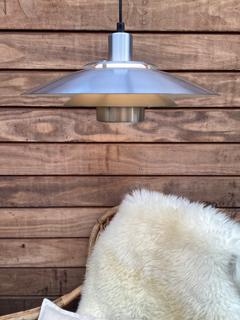 SMUKKESTE pendel fra Jeka i alu med akrylskærm i top, der sikrer et SMUKT lys. FLOT form med enkelte brugsspor i form af få små mærker på den store skærm og lidt på toppen, se billeder.