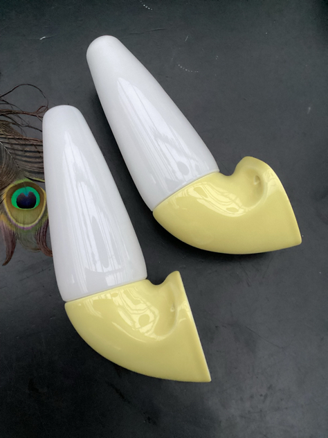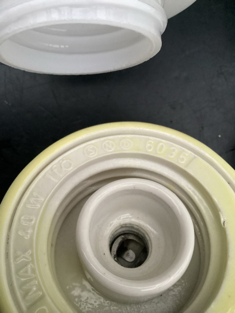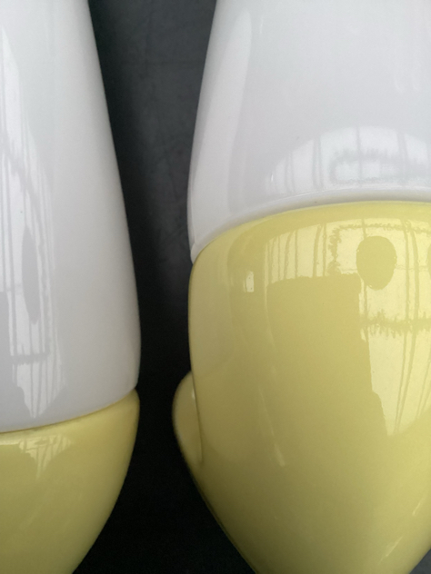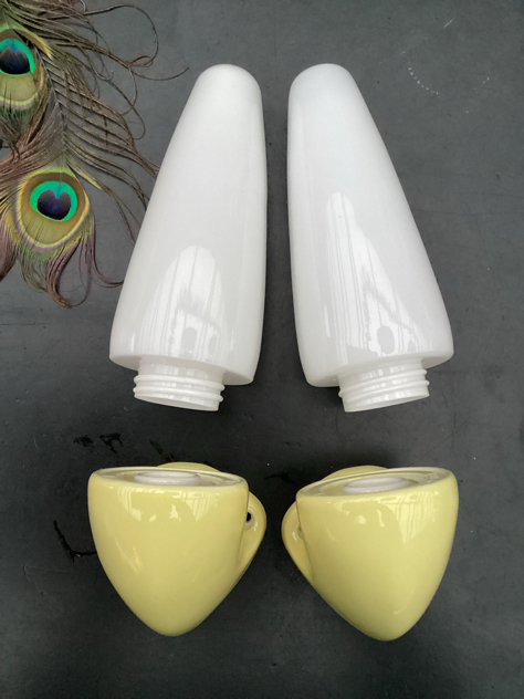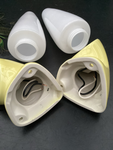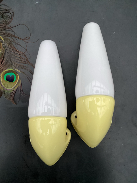Super FLOTTE Ifö badeværelseslamper, model 6035, designet af Stig Carlsson. Smuk, blank pastelgul porcelæn med opalglas i fakkelform. PERFEKT stand på både porcelæn og glas.