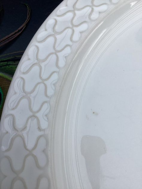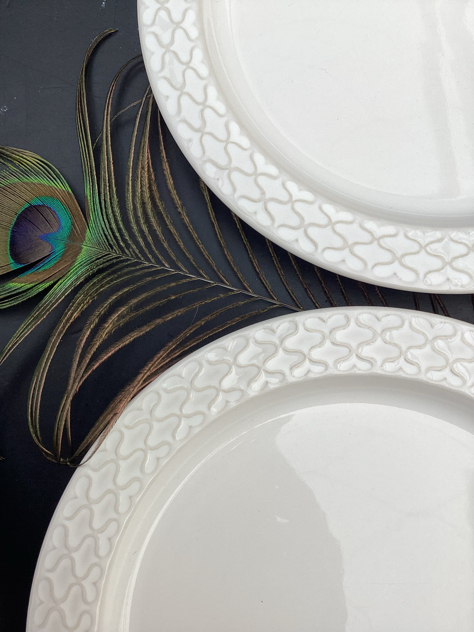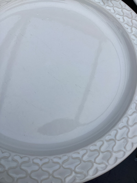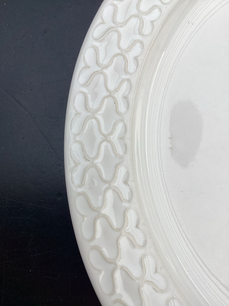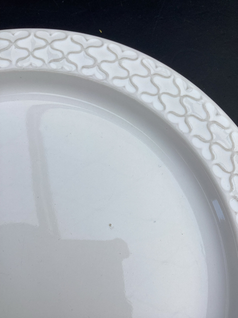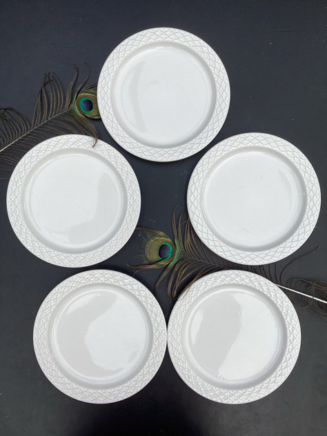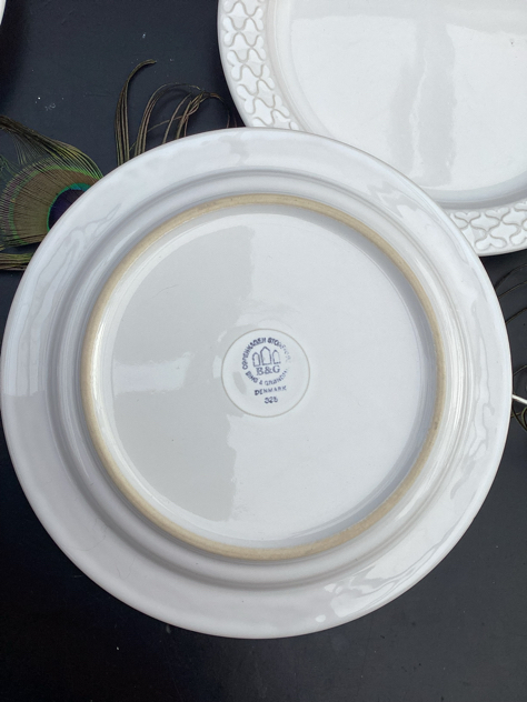 5 stk Quistgaard Palet middagstallerkner, i hvid porcelæn, designet af Jens Harald Quistgaard. Alle 5 fremstillet af Bing & Grøndahl, stempel herfra. Alle intakte, uden skår og revner. Men de har små mærker i glasuren og en enkelt har nogle ridser på spisefladen, se billeder.