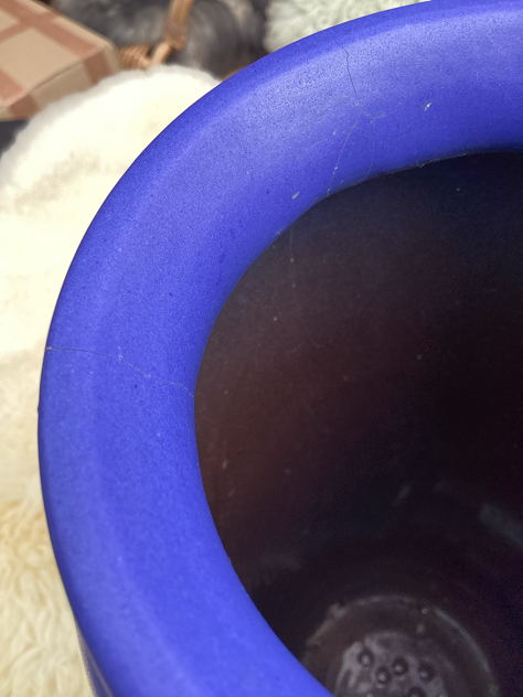 West Germany gulvvase med lækker-lækker mat koboltblå glasur, Scheurich. Har en medfødt nist i glasuren og desværre et par revner ved topkanten, se billeder. Holder fint vand, hvis den skal bruges til friske blomster.