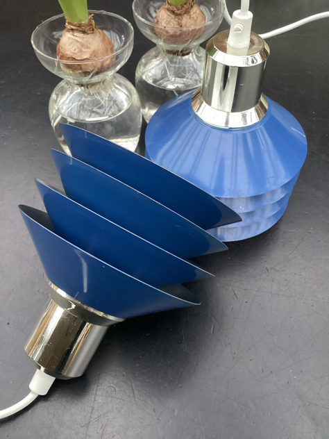 Fineste pendler i en lækker blå lakering. Model Siam fra Design Light, mærke herfra. Har lidt ujævnheder i lakeringen og lidt brugsspor på toppene og mikro malingsafslag på enkelte kanter, se billeder. Ellers flotte – også indvendig.