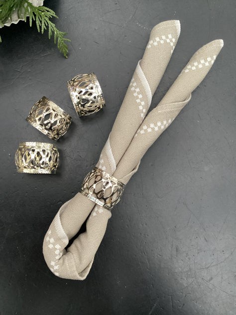 Fineste Servietringe i sølvplet med hulmønster. Har 16 stk – sælges i SÆT af minimum 4 stk.