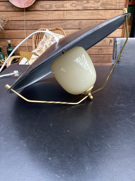 FINESTE vintage pendel i en SMUK kombination af blank elfenbensfarvet glas, detaljer i messing og sortlakeret skærm. FLOT stand med yderst få brugsspor på skærmen, der er lidt mat. Ligner LYFA i den tidlige periode…