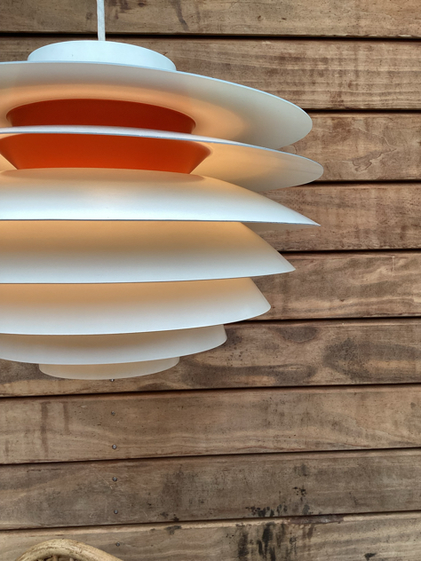 SMUKKE Verona pendler med 7 skærme, Ø40cm. Designet af Svend Middelboe for Nordisk Solar, mærke herfra. Hvidlakeret udvendig– indvendig er skærmene lakeret orange (originalt) ved kernen – giver et fantastisk LYS.