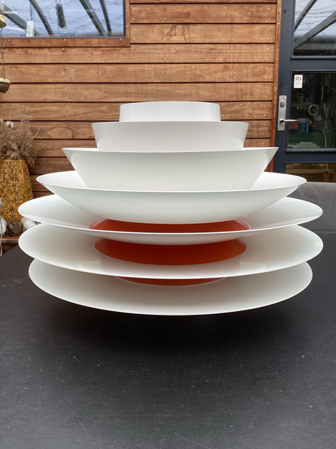 SMUK Verona pendel med 7 skærme, Ø48,5 cm. Designet af Svend Middelboe for Nordisk Solar, mærke herfra. Hvidlakeret udvendig– indvendig er skærmene lakeret orange (originalt) ved kernen – giver et fantastisk LYS.